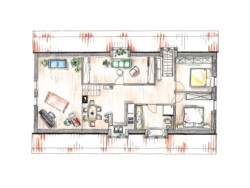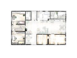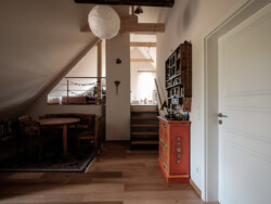 Die Bauherren verfolgten das Ziel, das seit 2013 leerstehende Haus durch behutsame Modernisierungsmaßnahmen und den Ausbau des bislang ungenutzten Dachstuhls wieder einer sinnvollen und wirtschaftlichen Wohnnutzung zuzuführen. Neben energetischen Maßnahmen – wie dem Aufbringen einer Holzweichfaserdämmung mit Lehmputz sowie dem Austausch der Fenster – war es vor allem wichtig, durch gezielte Eingriffe in den Bestand eine zeitgemäße Wohnqualität zu schaffen. Im Mittelpunkt stand dabei insbesondere das Belichtungskonzept.