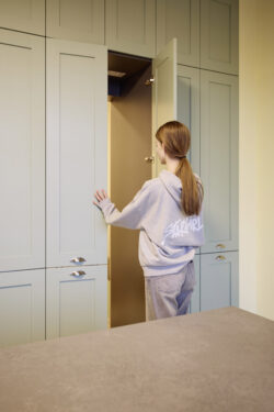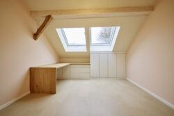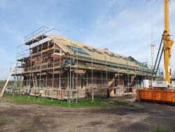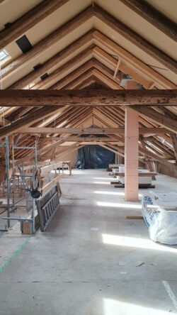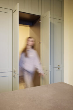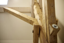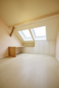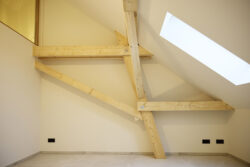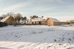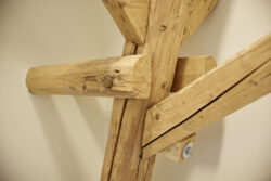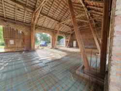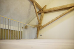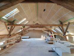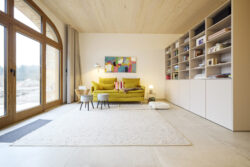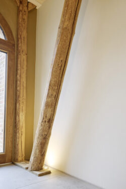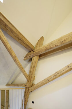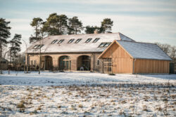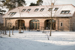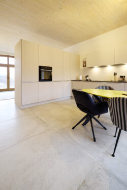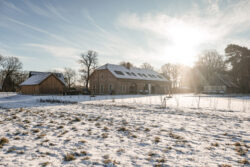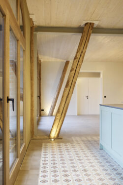 Der neue Grundriss fügt sich respektvoll in die vorhandene Gebäudestruktur ein, sodass die Kernelemente – wie die großzügigen Deelen und die eindrucksvolle Sturmbinderkonstruktion – dem Innenraum einen ausdrucksstarken Charakter verleihen. Gleichzeitig entsteht durch die Wahl wohngesunder und ökologischer Materialien wie Holz, Lehm und Stroh ein nachhaltiges Wohnkonzept. Um zeitgemäßen Wohnkomfort auf zwei Ebenen zu ermöglichen, wurde eine Brettsperrholzdecke eingefügt, die neben ihrer tragenden Funktion durch ihre natürliche Oberfläche auch gestalterischen Mehrwert bietet.