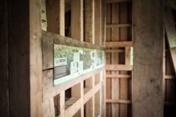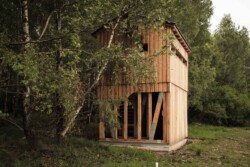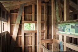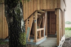 Die Zuwegung und der Eingang zur Plattform befinden sich gut sichtbar auf der Rückseite der Konstruktion. Über eine Treppe gelangt man auf die obere Ebene, die sich deutlich „geschlossener“ präsentiert. Diese gezielte Geschlossenheit ermöglicht es, Tiere in ihrer natürlichen Umgebung ungestört zu beobachten – ohne sie in ihrem Lebensraum zu stören oder zu beeinflussen.
