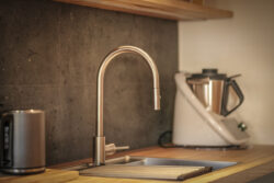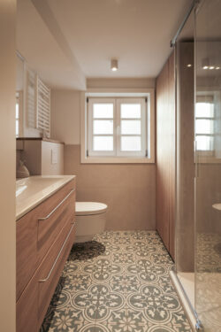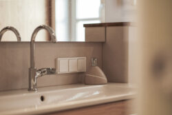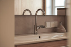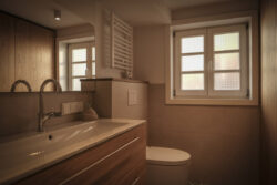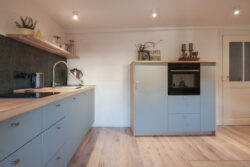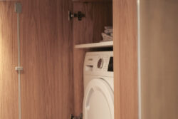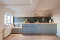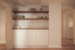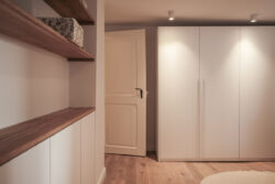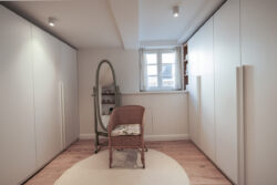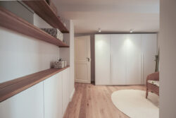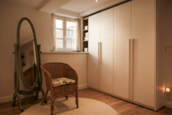Der gesamte Innenausbau – von der Küche über individuell geplante Stauraumlösungen bis hin zum vollständig erneuerten Bad – wurde präzise auf die räumlichen Gegebenheiten abgestimmt. Versteckte Details wie ein integrierter Schrank für Waschmaschine und Trockner sowie weitere Einbaumöbel tragen dazu bei, die vorhandene Fläche optimal zu nutzen und ein helles, harmonisches Wohngefühl zu schaffen.