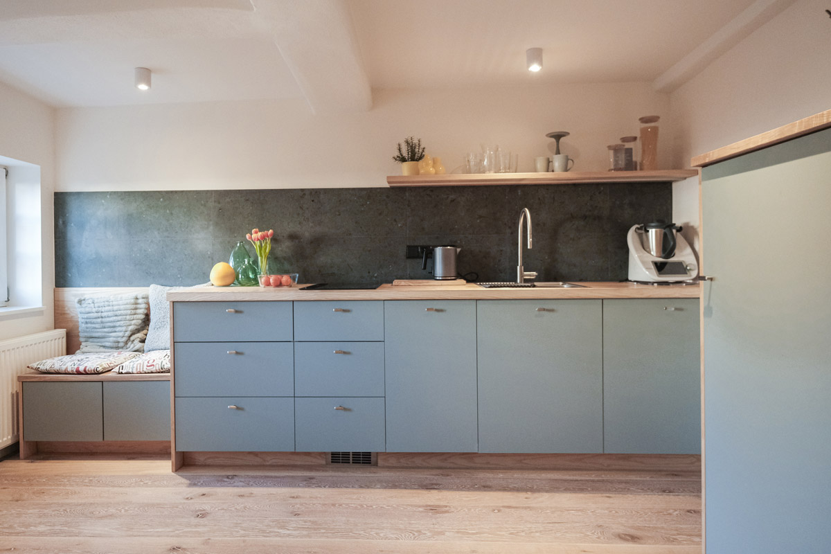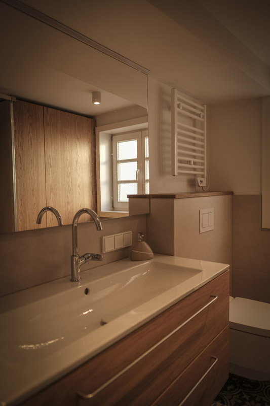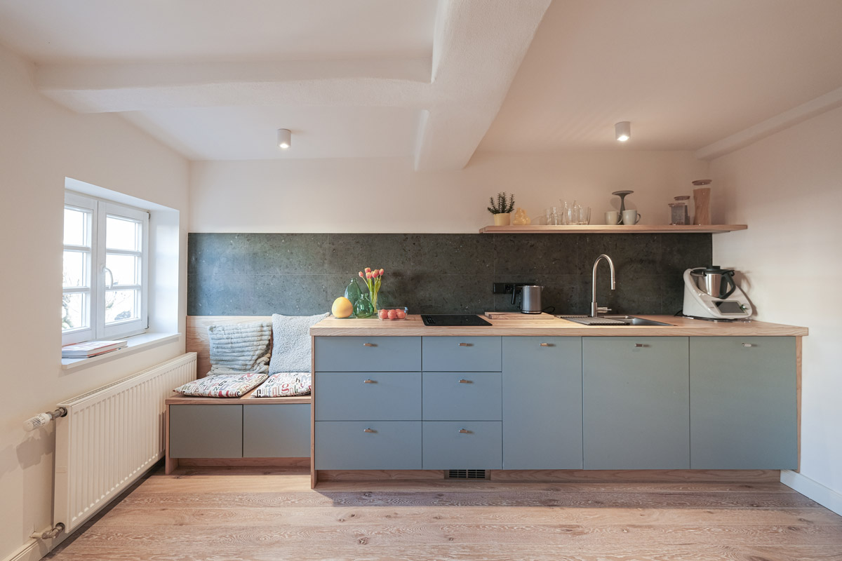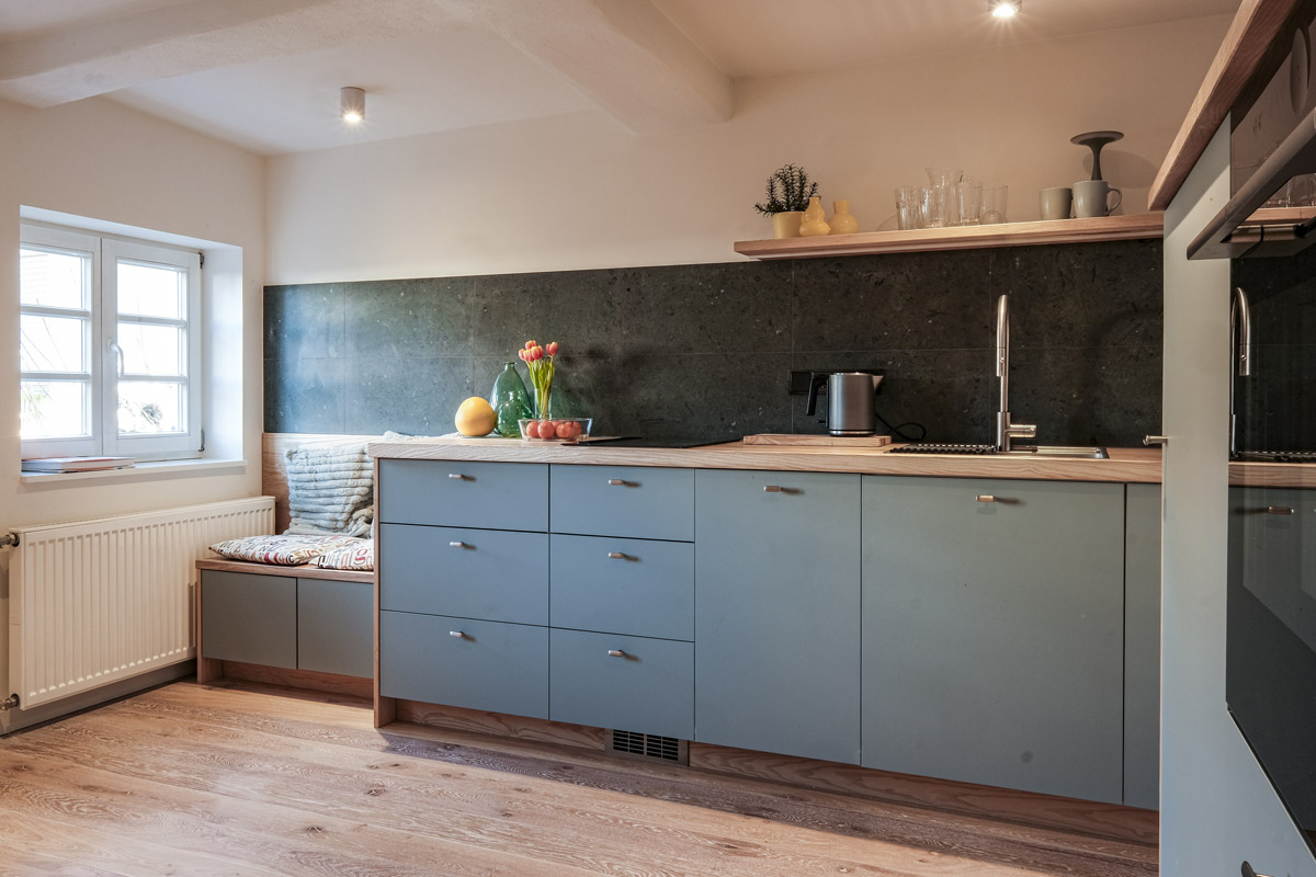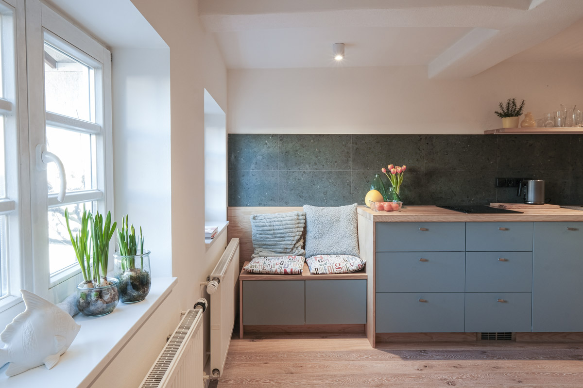 Der Umbau der kleinen Wohnung im historischen Fachwerk stellte besondere Anforderungen, denn die kompakten Räume verlangten nach einer Gestaltung, die möglichst viel Helligkeit zulässt. Unsere Leistungen umfassten dabei nicht nur die vollständige Planung der Innenarchitektur, sondern auch den Bau und den passgenauen Einbau der Küche sowie sämtlicher maßgefertigter Schränke.