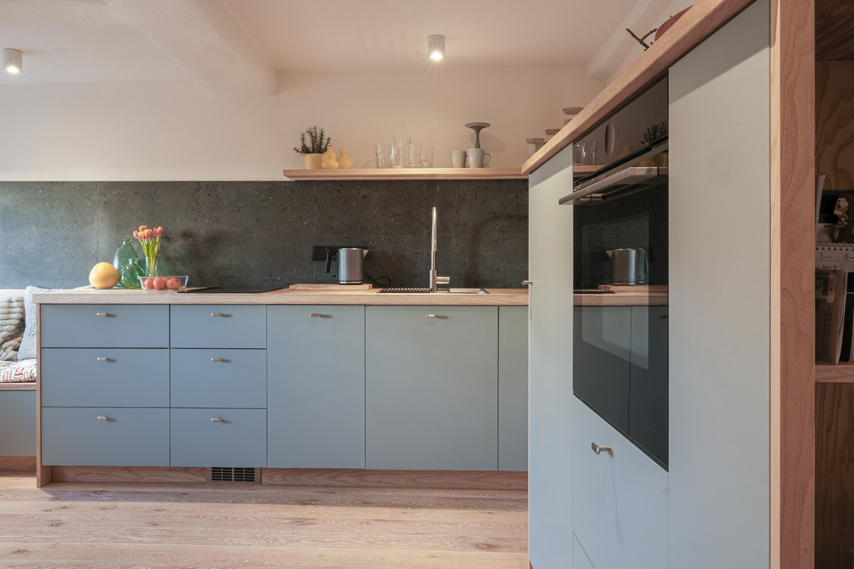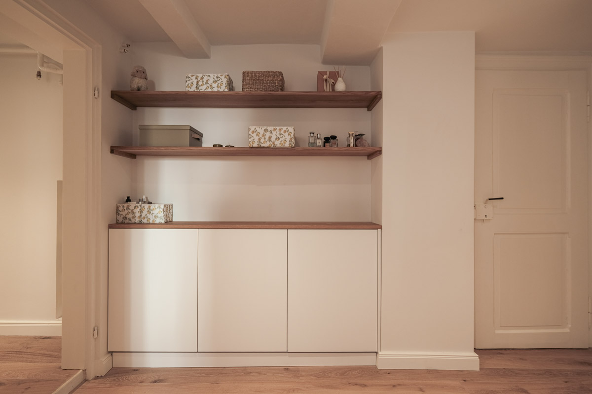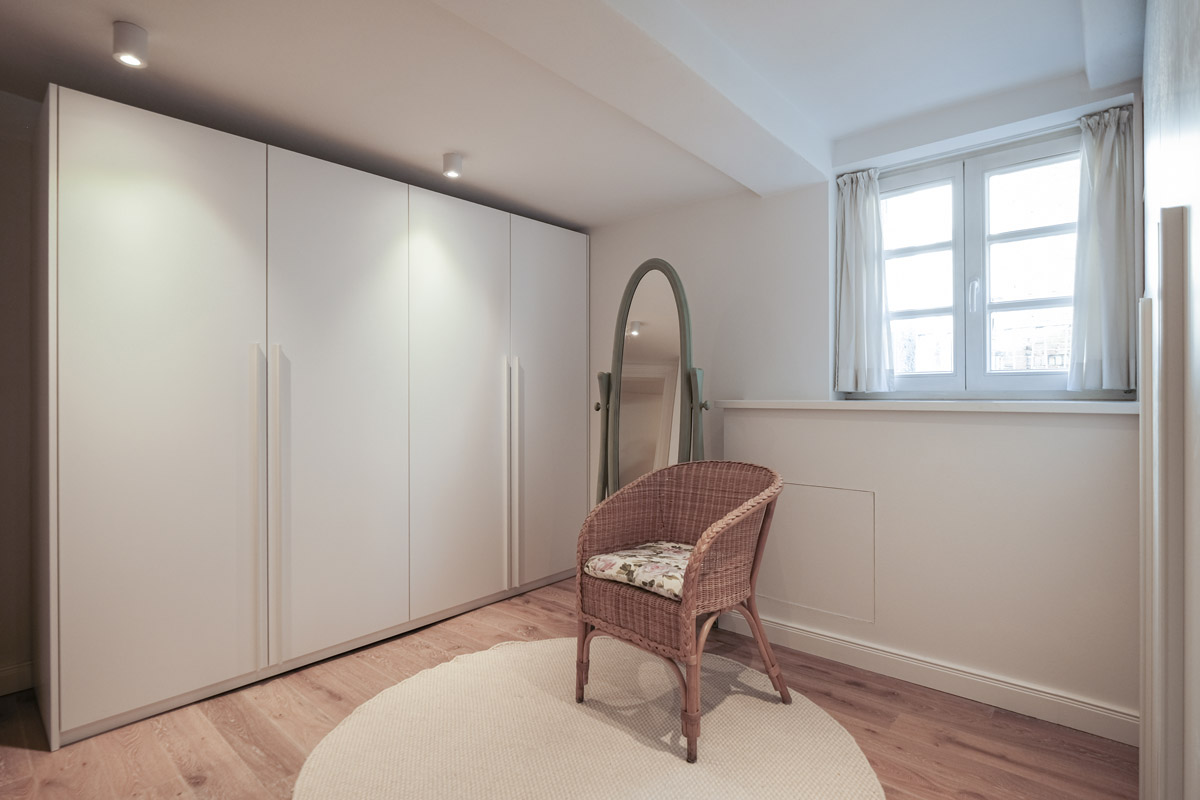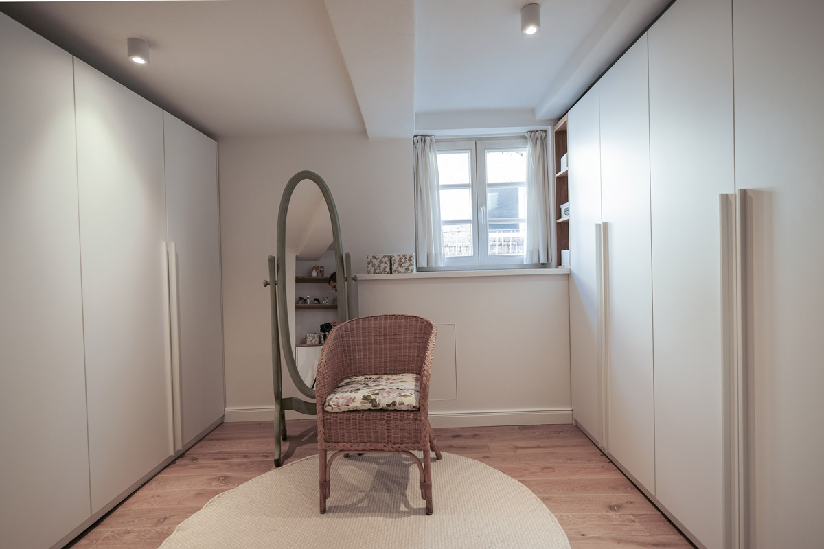 Der gesamte Innenausbau – von der Küche über individuell geplante Stauraumlösungen bis hin zum vollständig erneuerten Bad – wurde präzise auf die räumlichen Gegebenheiten abgestimmt. Versteckte Details wie ein integrierter Schrank für Waschmaschine und Trockner sowie weitere Einbaumöbel tragen dazu bei, die vorhandene Fläche optimal zu nutzen und ein helles, harmonisches Wohngefühl zu schaffen.