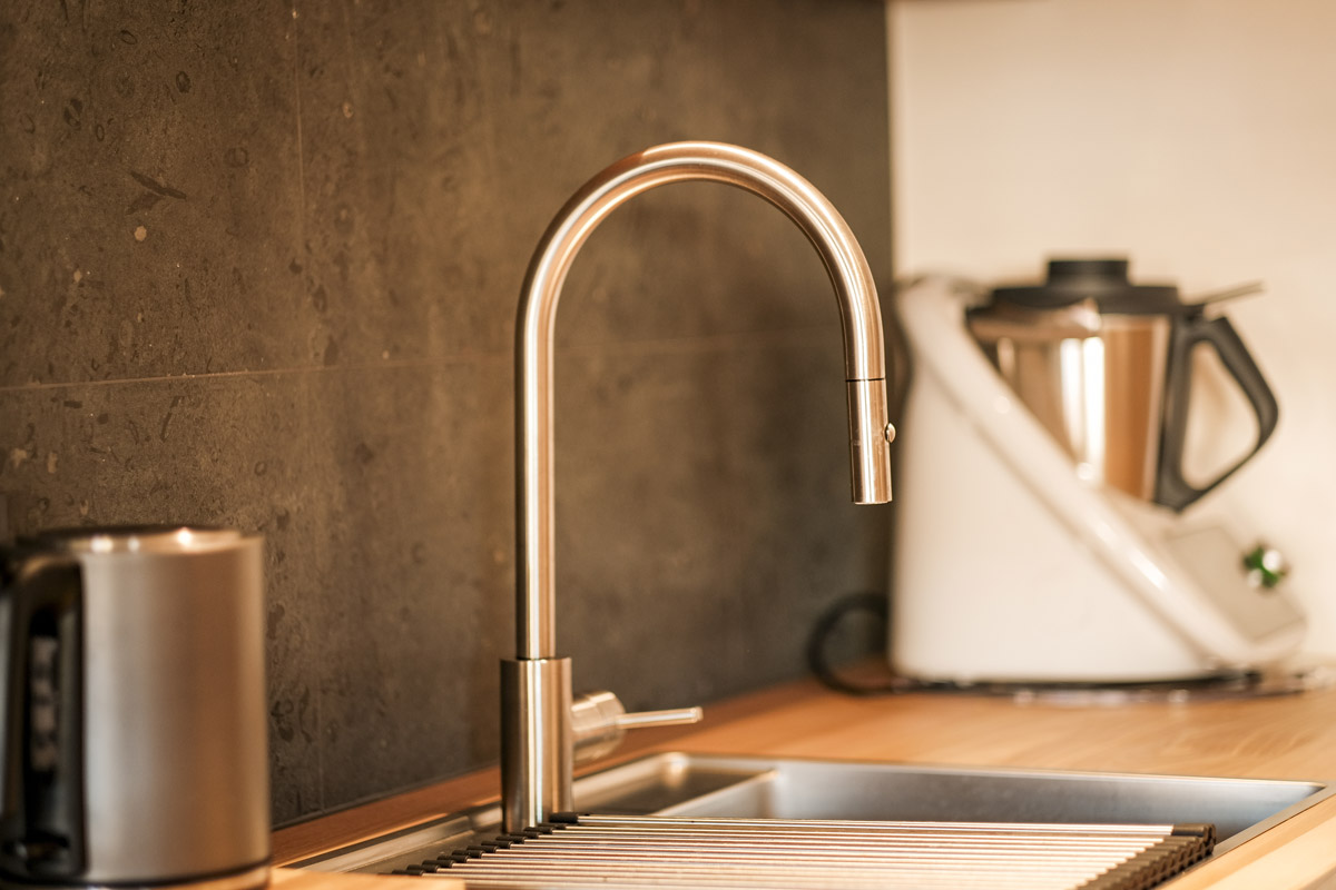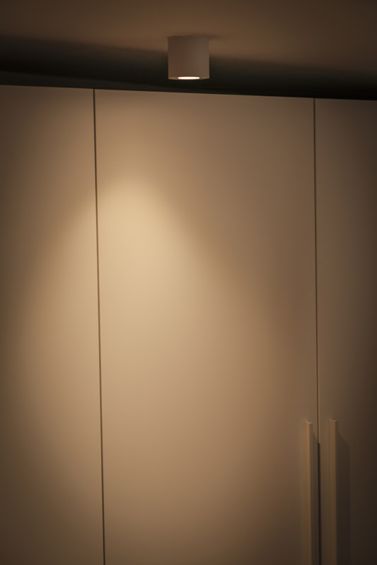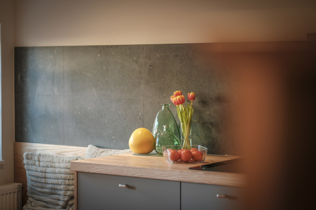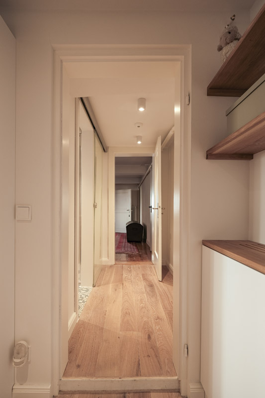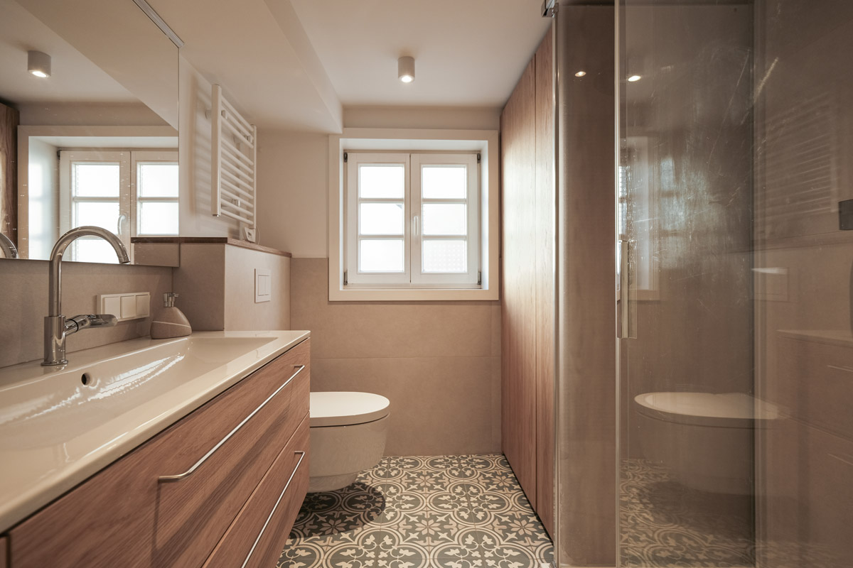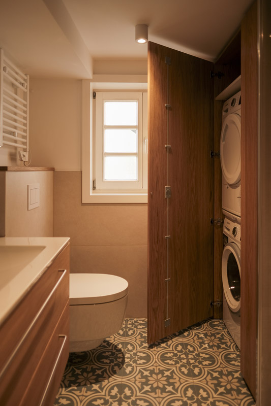 Der gesamte Innenausbau – von der Küche über individuell geplante Stauraumlösungen bis hin zum vollständig erneuerten Bad – wurde präzise auf die räumlichen Gegebenheiten abgestimmt. Versteckte Details wie ein integrierter Schrank für Waschmaschine und Trockner sowie weitere Einbaumöbel tragen dazu bei, die vorhandene Fläche optimal zu nutzen und ein helles, harmonisches Wohngefühl zu schaffen.