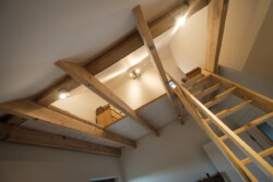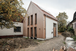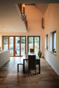 Im Innenraum wird man durch die ungewöhnliche Grundrissstruktur, die sich aus dem Knick ergibt, und Verknüpfungen der Ebenen über zwei Lufträume überrascht. Die ausgeklügelte Raumfolge bringt Weite in dieses mit 140 m² Wohnfläche eher kleine Objekt.