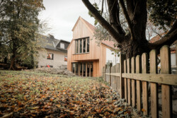 Der Anbau für die junge Generation steht bewusst zurück gesetzt, so dass auch der Apfelbaum im jetzigen Vorgarten, der dort schon lange verwurzelt ist, sein Zuhause behält.