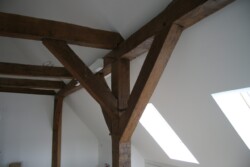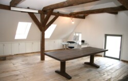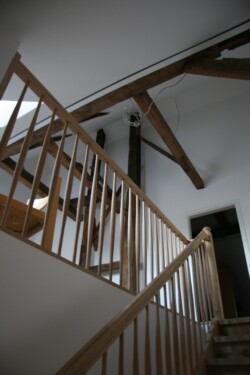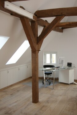 Das denkmalgeschützte Gebäude wurde erstmals im Jahre 1991 von unserem Vater, Architekt Raymund Gröne, zum Kindergarten ausgebaut. Im Rahmen des U3 Ausbaus wurde die Kindertagesstätte in Anreppen den neuen Anforderungen angepasst. Im Erdgeschoss wurde durch kleine Eingriffe ein neuer Ruheraum geschaffen und die Sanitäranlagen angepasst. Das Dachgeschoss wurde zum Büro und Personalraum umgebaut. Dabei konnte die Jahrhunderte alte Holzkonstruktion durch eine klare, moderne Gestaltung der Räume und Wandflächen in Szene gesetzt werden und dieser einzigartige Kindergarten mit einem ebenso einzigartigen Dachraum erweitert werden. Der individuell angefertigte Fußboden besteht aus massiven Eichenbrettern in 2,5cm Stärke. Die Bretter wurden von einem örtlichen Zimmereibetrieb eigens zugeschnitten und gebürstet, sonst sind die Eichenbretter komplett naturbelassen. Die sägerauhe Oberfläche wird im Laufe der Jahre seine ganz eigene Patina entwickeln. So entwickelt sich ein spannungsreiches Spiel zwischen den glatt-weißen Oberflächen der Dachflächen und den warmen, natürlichen Oberflächen der Holzbauteile.