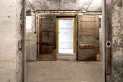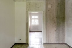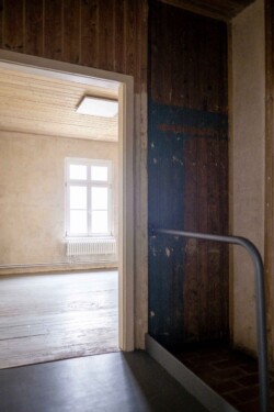In aufwendiger Kleinarbeit wurden über Wochen und Monate hinweg Spuren der Vergangenheit an Wänden, Decken und Böden freigelegt. Anders als bei vielen Sanierungen stand nicht ein ästhetisch perfektes Ergebnis im Vordergrund, sondern der bewusste Erhalt von Nutzungsspuren – etwa Brandflecken der Häftlingsöfen oder der eingebrannte Abdruck eines Bügeleisens an einer Holzwand.