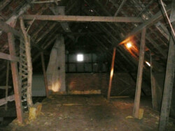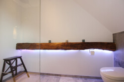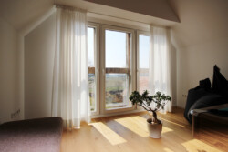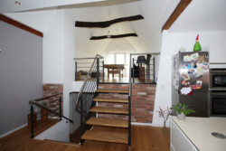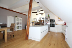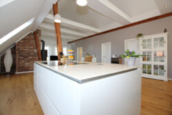 Der Zugang zur Wohnung der jungen Familie erfolgt über die alte Kornkammer im Dachgeschoss. Dort befindet sich der Lebensmittelpunkt der Familie in einem offenen, großzügigen Wohnbereich, in dem Essen, Kochen, Wohnen und Spielen ineinander übergehen. Über eine kurze Treppe gelangt man ins Obergeschoss, wo sich die privaten Räume, wie Bad, Schlaf- und Kinderzimmer, angliedern.